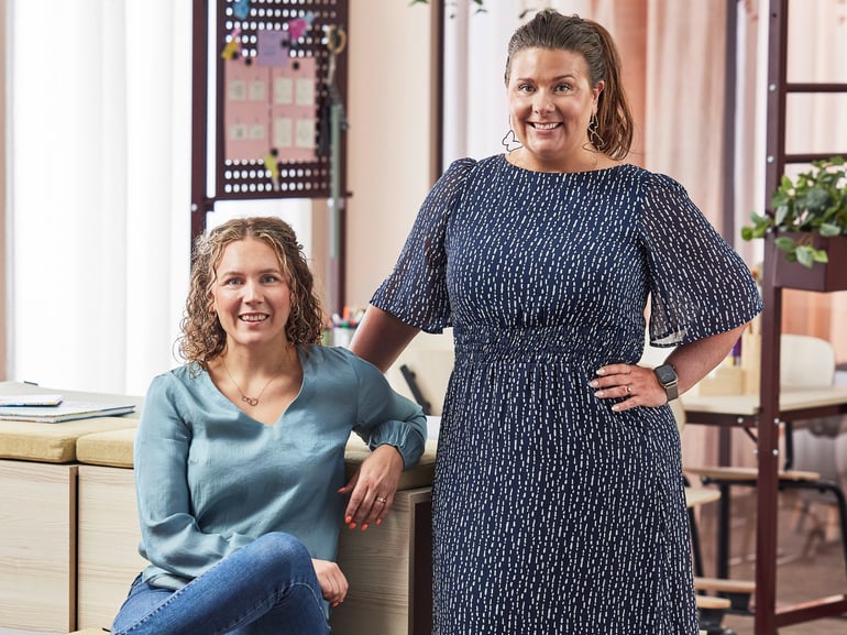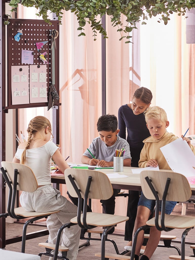 Þessi kennslustofa er hönnuð til að virkja sköpunargáfu nemenda í gegnum samvinnu. Með bleikum, gulum og fjólubláum tónum leggjum við áherslu á gleðina og hlýjuna sem myndast við samstarfið. Kennslustofan er full af fjölnota svæðum sem gera öllum auðvelt að finna sér stað. Og að sjálfsögðu eru allir fletir aðlagaðir að fjölbreyttum hópi einstaklinga og ólíkum námsþörfum þeirra.
